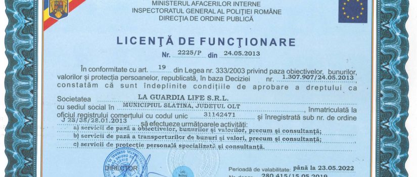 Activitatea de proiectare, instalare, depanare si intretinere a sistemelor electronice de supraveghere si detectie la efractie desfasurata de LA GUARDIA LIFE este reglementata de Legea 333/2003 si HG 1010/2004, societatea fiind avizata in acest sens cu Licenta nr. 5181/T eliberata de Inspectoratul G...