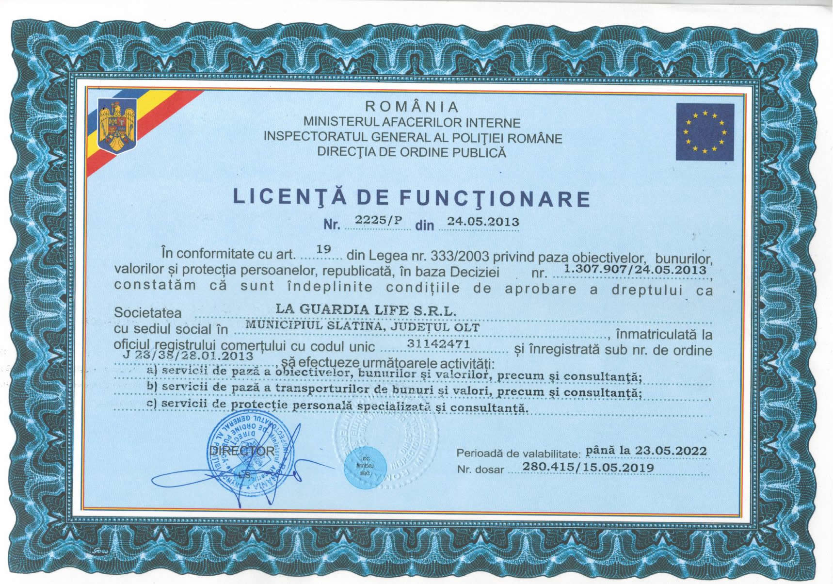 Activitatea de paza si protectie desfasurata este reglementata de Legea 333/2003 si HG 1010/2004, societatea noastra fiind avizata in acest sens cu licenta nr. 2225/P eliberata de Inspectoratul General al Politiei Romane. LGL asigura cu succes servicii de paza si protectie pentru obiec...